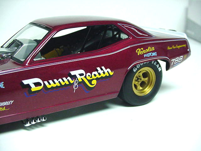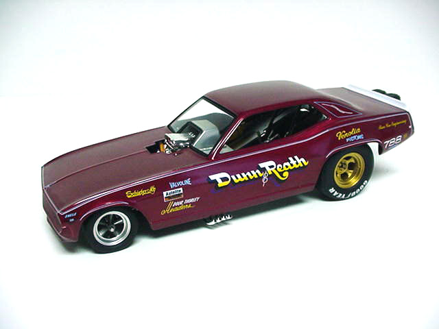 Jim Dunn's 1971 Dunn&Reath 'Cuda F/C Bob Frey Remembers... "One of the great things about drag racing is that there is no "right way" to do anything. The challenge of making your car go faster than the other guy's has been with us for as long as we've had the wheel, and that's a few years now. That's why, when Jim Dunn came out with his rear-engine funny car in 1972, most people were a bit skeptical, but after the "Supernationals" that year, most of those skeptics became believers. Jim Dunn, the fireman from LaMirada, California, figured that if the dragsters could run better with the engine in the rear, then so could the funny cars. The problem was that no one had ever been able to make one of these creations competitive before; in fact, they could hardly keep them on the ground literally! But, after a few false starts, "Big" Jim came to Ontario Motor Speedway and did what had previously been deemed impossible; he won the sport's biggest race in the sport's strangest car. The guy who used to race a short wheelbase Volkswagen with a Chrysler motor in it, had made a rear-engine funny car that could not only compete with the conventional cars, it could beat them. And to make matters even sweeter, in the first round of that great race, Jim beat Don Prudhomme who was debuting a brand new, state-of-the-art car that came complete with low aerodynamics, louvers in the hood and special bubbles over the front wheels for clearance. So much for state of the art, huh?" - Bob Frey (October 2002) Legend, hero, icon, husband, father, grandfather, this is Jim Dunn. Born March 28th, 1934 in Artesia, Ca. Jim now resides in Long Beach, Ca. with his wife Diane. Jim was a Los Angeles County Firefighter for almost three decades beginning in 1969 until his retirement in 1994. Early in the 50's drag strips around Southern California were coming into prominence. It was on these tracks Jim began his racing career. Highly regarded and feared as a driver, Jim raced every kind of car one can imagine, enjoying success at each level. Success on American soil is only part of the legacy. Jim has raced on an international scale as well, setting and holding track records in both Japan and Australia. Jim's records as a driver and crew chief are astounding. During his career he has amassed an incredible list of wins and records. In 1981 he was named Pro Driver of the Year and finished 10th in the NHRA points standings. In '72 he won the Supernationals in Ontario, Ca. with his radical rear engine Barracuda, something many believed could not or would not happen. Jim proved them wrong. Jim Dunn racer became Jim Dunn movie star in 1972, when his year of racing was documented in the movie "Funny Car Summer". Jim was runner-up at the U.S. Nationals in 1981 and would win the World Finals in Irvine, Ca. that same year. In 1990 Jim retired from driving, becoming crew chief on the Snickers funny car. In 1992 Jim would once again have his own team . Many believe the greatest accomplishment a team can enjoy is a victory in Indy at the U.S. Nationals. Jim, Diane, Jon and the entire team felt that exileration in 1999 when they won at Indy. The year 2000 saw Jim celebrate his 50th year in racing, a milestone few will reach. We thank Jim for everything he has done to make drag racing the sport it is today. We can only guess where our sport would be without men like him. Someone once asked "What would drag racing be without Big Jim?" We wonder! - Courtesy of Steve & Kathy Dull (www.nitrosteve.com) Limited edition of 5000 pieces. £66-99 Home |