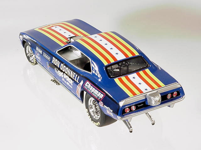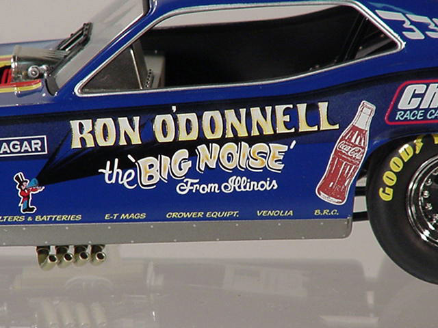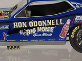 Ron O'Donnell's Big Noise 'Cuda OK, so everyone knows that the name of the state is pronounced without the "s" at the end, but the "Big Noise From Illinoi" just doesn't have the same ring to it, does it? Actually, in the environmentally conscious 1970's, the "Big Noise" from anywhere didn't sound correct (politically correct wasn't even a term then) so Ron O'Donnell changed the name of the car to the "Damn Yankee." There, that shouldn't offend anyone, should it? But then, when you grow up on the south side of Chicago, offending anyone never seems to be a real problem. Ron O'Donnell was one of many very successful match racers from the "Windy City." In a town that would produce such notables as "Mr. Norm," Gary Dyer, Kenny Safford, the "Chi-Town Hustler," Don Schumacher, Ron Pellegrini, Dale Creasy Sr., Gary Bolger, Cliff Brown and many more, Ron was one of the best, most talented and most versatile of the bunch, and match racing was a way of life for him. In the early '70's most Funny Car drag racers made their living by traveling the country in search of the perfect match race, a best two-out-of-three or three-out-of-five encounter that would pack the fans into the local tracks. Ron, who actually took his first ride in one of the legendary "Mr. Norm" cars, would become a fixture at places like Byron Dragway, Cordova and other non-national event tracks. And, while he did have moderate success on the IHRA circuit in the early '70's, where he went to a pair of final rounds, most of his fame and notoriety came on the local level. Ron may have driven more cars down more bad tracks than just about any other driver in the history of the sport, and it was on those tracks where his ability to work on and adjust the clutch really paid off. His beautiful red, white and blue car began life as a Barracuda, later became a Chevrolet Vega and, believe it or not, ended its career as a Mustang, a badly burned Mustang, but through it all, Ron O'Donnell made some really big noise in the drag racing world. Only 2000 pieces of the "Big Noise" funny car were made. Now in stock, price £66-99