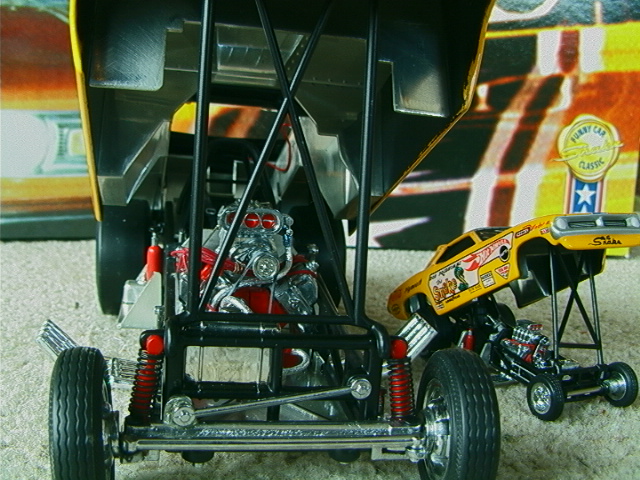 ship over to the floppers. Back to the models, I must admit that I have a soft spot for any cars that have been sponsored by toy companies (Cox and Chaparral would be a case in point) because it guarantees that a decent model will be forthcoming. The early Hotwheels models, and indeed the Monogram kits, were good but not entirely accurate in that they used a chassis that differed only in the injector intake. The Legends models again, as per the prototypes, share a large number of common components but there are noticeable differences between the two such as the fuel tanks. As first generation flip-top funnies it was thought at the time that both front and rear suspension was required and indeed this has been incorporated in the models. Other touches that stand out are the braided fuel lines with blue/red "Aeroquip" colour fittings and wiring and control linkages. Overall these models have been manufactured to an exceptionally high level and it is also true for the accompanying 1/64 scale pieces (which simply should not be compared to the old red-line racers which are fun to own but not very well detailed - as a piece of trivia I recollect a short drag racing documentary film in which McEwen is surrounded by boys, he asks them whether they have the Hotwheels toys and then goes on to ask which one was faster, they all say the Snake which was also true for mine). If there is a fault with the models it is that they have chosen to use the later versions with the all too obvious roof spoliers, spoilers is certainly the right term as both the Duster and Barracuda bodies looked better without them and I have absolutely no idea why Mattel did not opt for the cleaner original versions. . £ 53-99 each, inclusive of postage to UK addresses, bear in mind that these were issued at $120 stateside and you might agree that they are now something of a bargain for the larger diecasts, and of course you get the smaller models as well. (No I don't want to sell the old race set) Home |